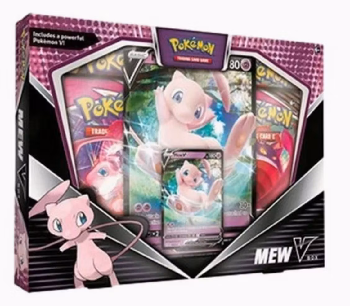 En standard Mew V Box(den som ble utgitt i november 2022) inneholder totalt 4 booster-pakker. Siden Pokémon-produkter ofte produseres i flere omganger, kan det nøyaktige innholdet i pakkene variere litt, men den opprinnelige utgivelsen inneholdt vanligvis en blanding av sett fraSword & Shield-æraen: