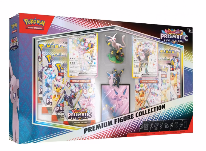 The Pokémon TCG: Scarlet & Violet—Prismatic Evolutions Premium Figure Collection includes:1 etched foil promo card featuring Espeon ex1 etched foil promo ca