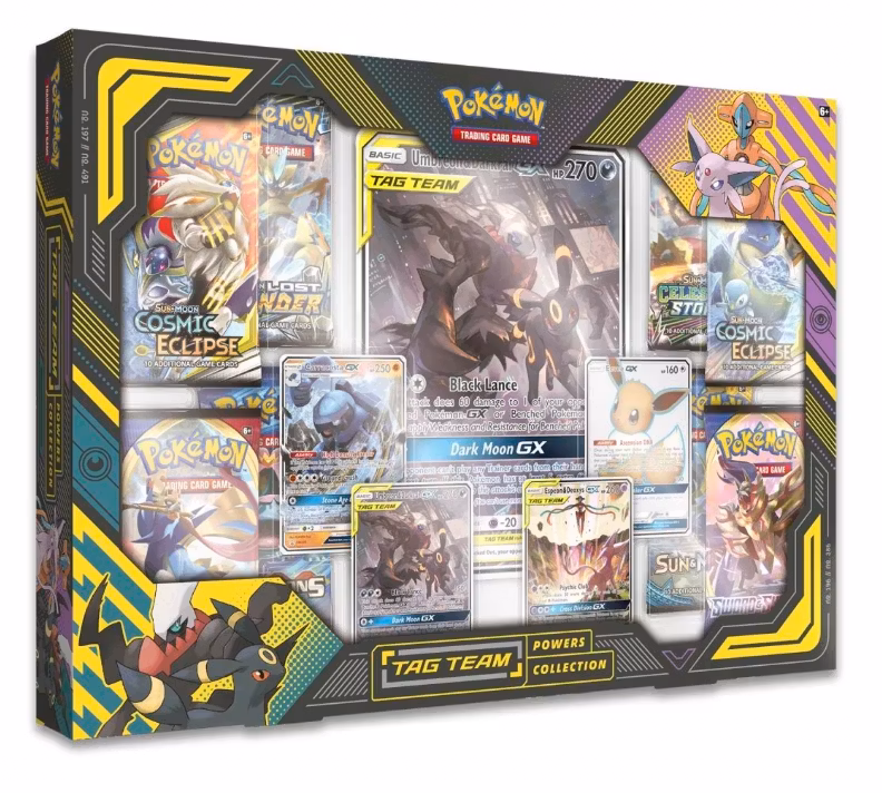 This Pokémon TCG: TAG TEAM Powers Collection includes:1 full-art foil card featuring Espeon & Deoxys-GX1 full-art foil card featuring Umbreon & Darkrai-