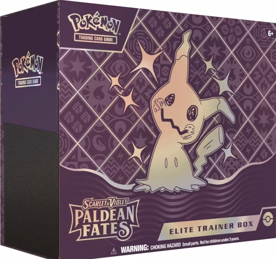 9 Pokémon TCG: Scarlet & Violet-Paldean Fates booster packs 1 full-art foil promo card featuring Shiny Mimikyu 65 card sleeves featuring Shiny Mimikyu 45 Pokémon TCG Energy cards A player's guide to the Scarlet & Violet-Paldean Fates expansion 6 damage-counter dice 1 competition-legal coin-flip die 2 plastic condition markers A collector's box to hold everything, with 4 dividers to keep it organized A code card for Pokémon Trading Card Game Live