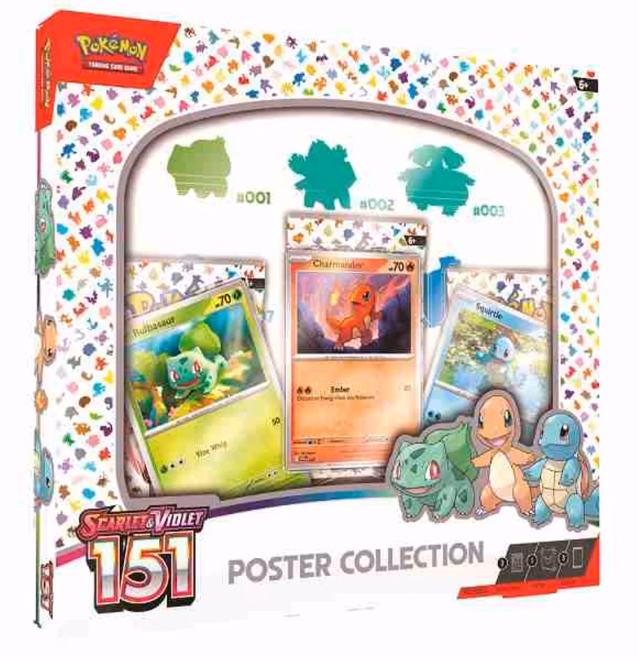 Innholder:3 stk. S&V 151 booster packs1 stk. Bulbasaur holo promokort1 stk. Charmander holo promokort1 stk. Squirtle holo promokort1 stk. plakat med motiv a