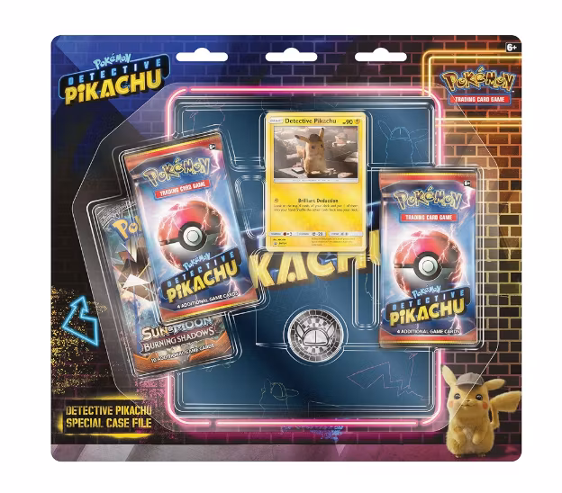 1 promo card featuring detective pikachu—on the case!1 metallic coin inspired by detective Pikachu2 Pokémon TCG: detective Pikachu booster packs1 Pokémon TCG: S