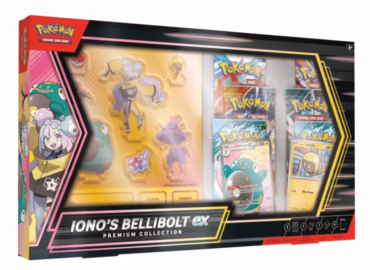 The Pokémon TCG: Iono’s Bellibolt ex Premium Collection includes: • 1 full-art foil promo card featuring Iono’s Bellibolt ex • 1 foil card featuring Iono’s Tadbulb • 1 sheet of acrylic standees featuring Iono, Bellibolt, and more • 1 double-sided backdrop display • 1 photo sticker featuring Iono and Bellibolt • 6 Pokémon TCG booster packs • A code card for Pokémon TCG Live