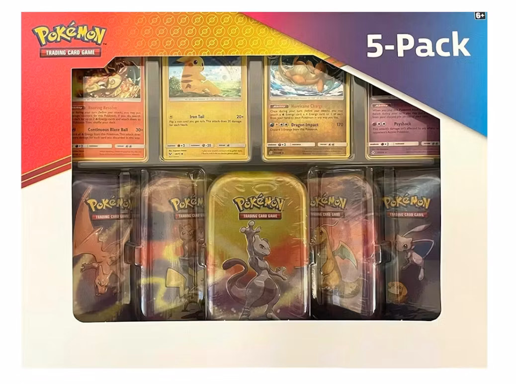 - Fire stk promokort: Charizard, Pikachu, Mewtwo og Dragonite.