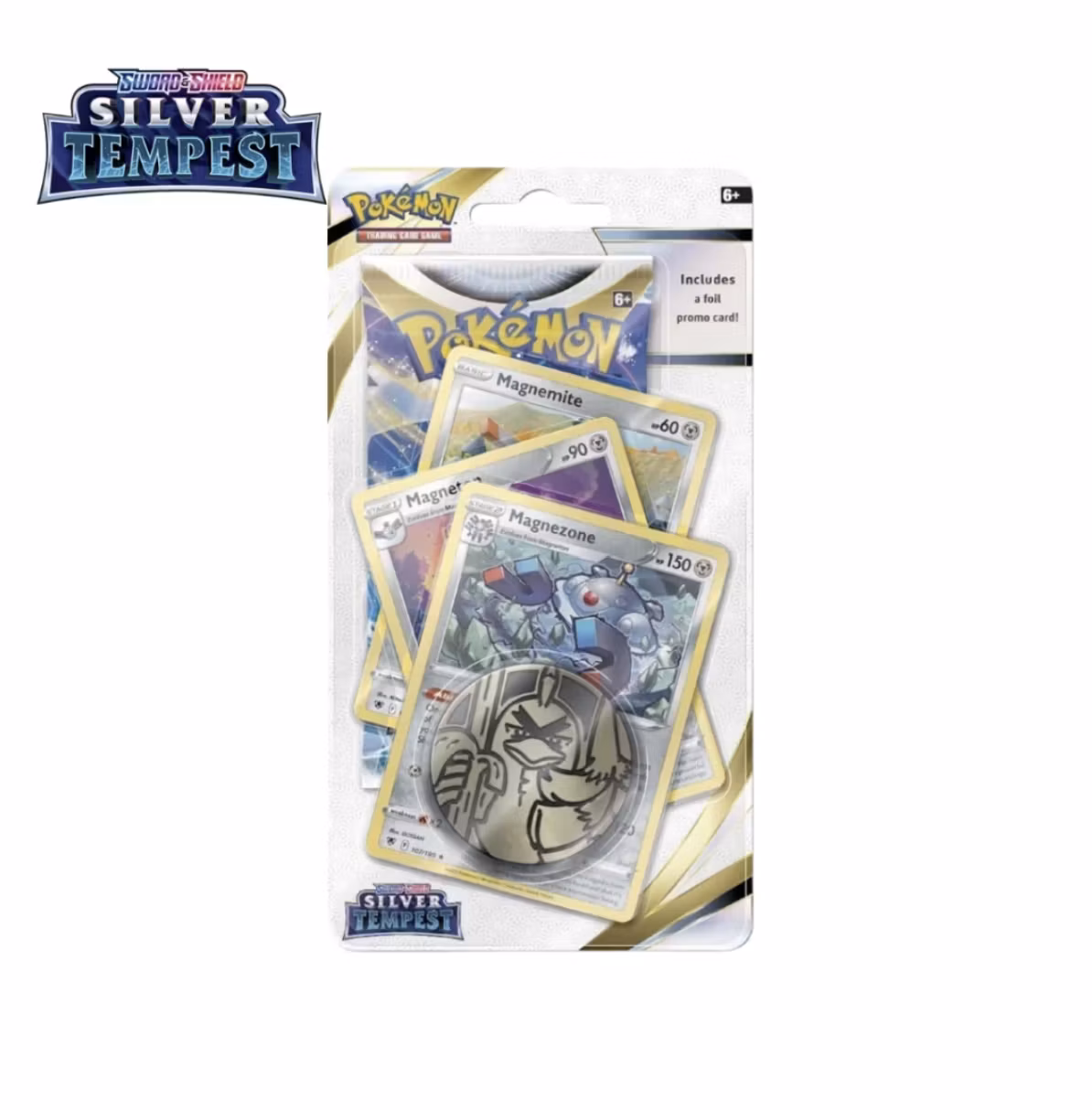 Hver Premium Checklane Blister inneholder 1 Silver Tempest boosterpakke, 3 promokort og 1 mynt