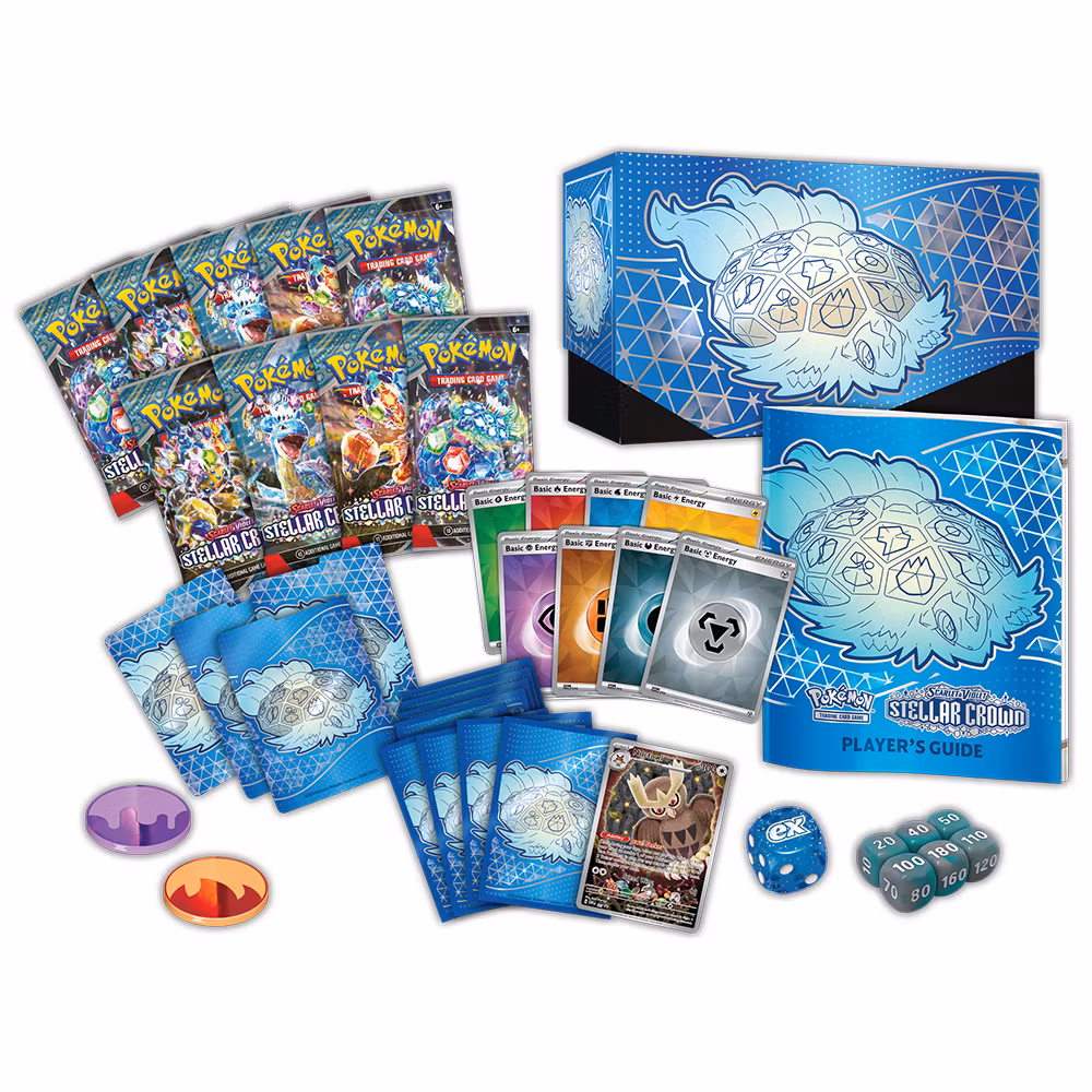 9 Pokémon TCG: Stellar Crown boosterpakker 1 fullkunst folie promo-kort65 Sleeves45 Pokemon TCG Energi kortEn spiller’s guide til Stellar Crown6 skade-tell