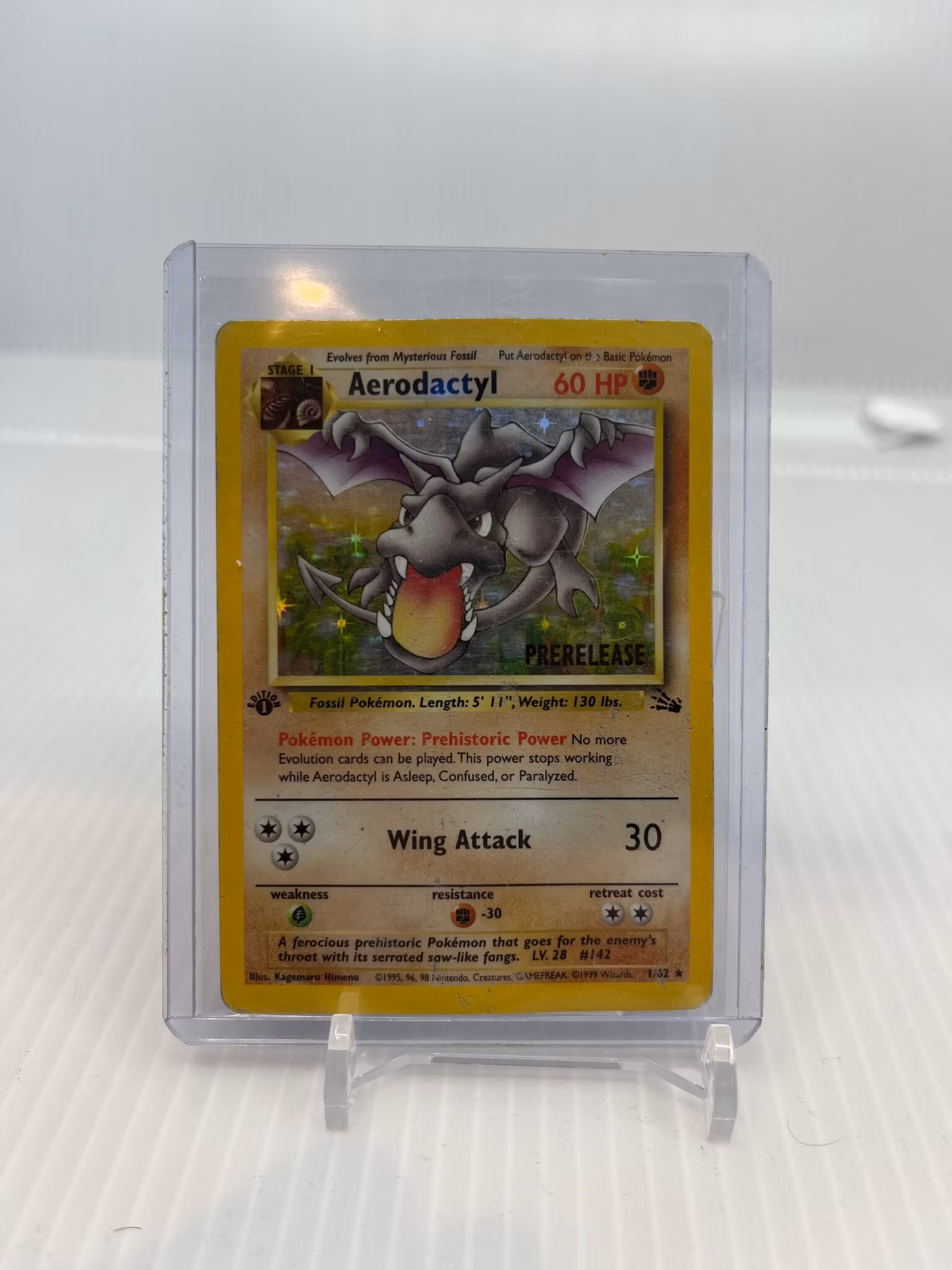 Aerodactyl (PreRelease) 1/62 1st Edition Fossil (SJELDEN). Den er relativt skadd men det er et veldig sjeldent kort, så et utrolig kult tilskudd til en hvilken som helst samling!